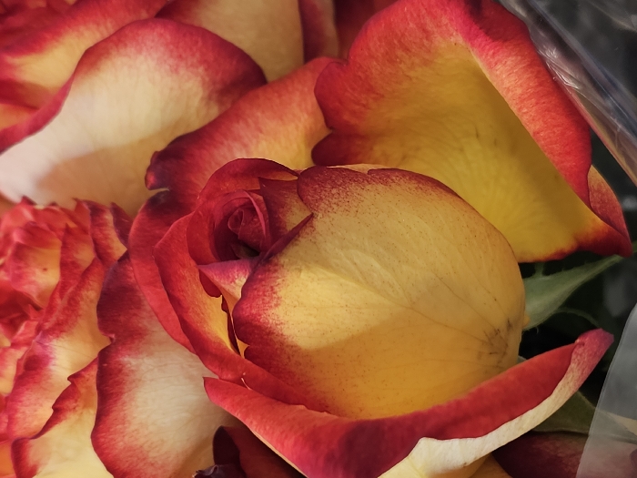 - "A close-up captures a cluster of roses, their petals displaying a striking gradient of yellow and red" by FM-n22Rc2, licensed under CC BY 4.0