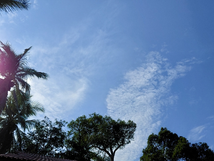 The image presents an upward view of the sky and tree line over Blang Pohroh, Indonesia. The sky is predominantly clear blue with scattered white altocumulus cloud formations, particularly dense in the mid-left and upper-right quadrants. A purple lens flare, indicative of sunlight, is visible on the upper-left side of the frame. In the foreground, the upper canopy of multiple dark green trees is visible. A prominent palm tree is silhouetted on the left, with its fronds extending into the sky. Other broad-leaf trees with dense foliage are present across the lower-center and right. The upper edge of a reddish-brown tiled roof is partially visible in the lower-left corner of the image. No individuals, animals, specific actions, or interactions are present within the depicted scene.