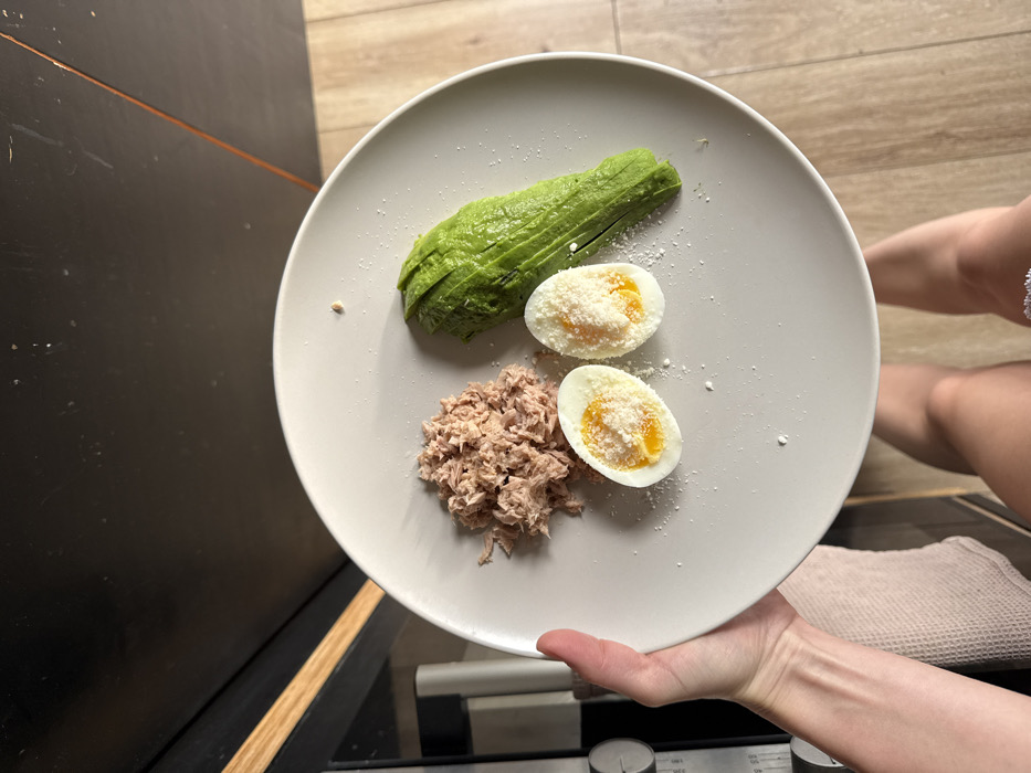 A white plate contains a meal comprised of half an avocado sliced lengthwise, a pile of tuna, and two halves of a hard-boiled egg. Each egg half has a light dusting of white powder, possibly cheese. The plate is held by a hand. The background reveals a dark surface, possibly a countertop, with lighter wooden accents and a glimpse of a person's legs.
