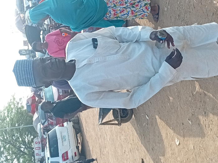 An elderly man wearing a white robe and patterned kufi stands outdoors holding a small container. He is surrounded by a crowd of people, vehicles, and potentially a POS machine in the background. The ground is brown and dry, and the lighting suggests it's daytime. A woman wearing a pink shirt stands close by. The image appears to capture a candid moment in a busy, public setting.