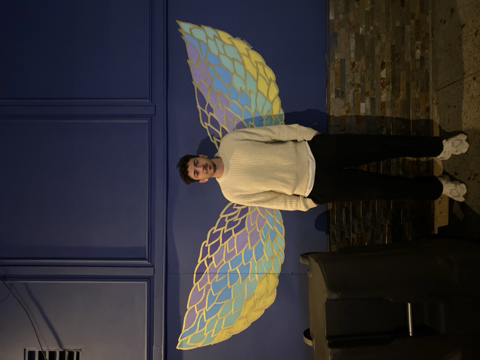 A young adult male stands centered in front of a deep blue wall featuring a vibrant, stylized wing mural in an urban setting in New York City, United States
