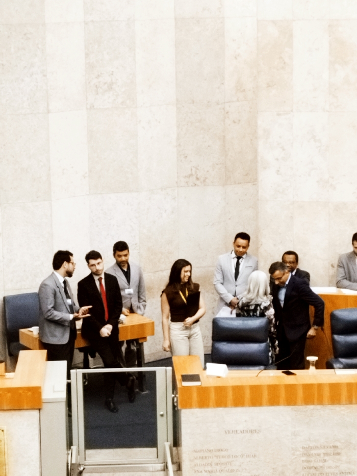 A group of well-dressed individuals gathers inside a room with high ceilings and marble walls. Several men wear suits and ties, while a woman sports a casual top and pants. They stand around wooden desks with chairs, engaged in conversation. The setting suggests a formal or governmental environment, possibly a council chamber. Their expressions vary, hinting at active discussions or preparations for an event.