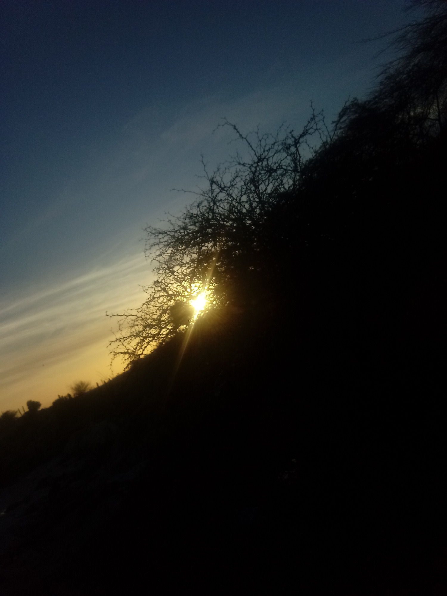 The image captures a sunset scene in what appears to be a natural environment, possibly in the vicinity of Juan Griego, Venezuela. A bright sun is partially obscured by a dense, leafless tree or bush, casting rays of light. The sky transitions from a deep blue to an orange hue near the horizon. The foreground consists of a dark, undefined area, potentially a hill or a dense cluster of vegetation. There are hints of sparse foliage or small trees silhouetted against the sunset on the horizon. No people are visible.