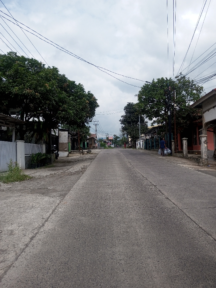 The image depicts a straight, two-lane concrete road in Khajuripada, India, viewed from a low angle, extending into the distance under an overcast sky. The road surface shows visible wear and expansion joints. On the left side, a dirt shoulder abuts a concrete sidewalk, beyond which are structures, including a white corrugated metal fence, buildings, and densely leafed trees. Overhead utility wires crisscross the frame from the left. A partially visible dark-colored scooter or motorcycle is parked near the sidewalk on the left. On the right side, a dirt shoulder and concrete sidewalk are present, followed by various buildings, some painted a light pink or peach, and more trees. Utility poles supporting a dense network of overhead wires are prominent on the right. In the mid-ground on the right side of the road, a male individual in a dark blue shirt and dark pants walks towards the foreground, carrying multiple clear plastic bottles filled with liquid in both hands. In the far distance, another indistinct figure is visible on the road. The overall environment appears semi-urban or rural, with residential or small commercial structures lining the thoroughfare.