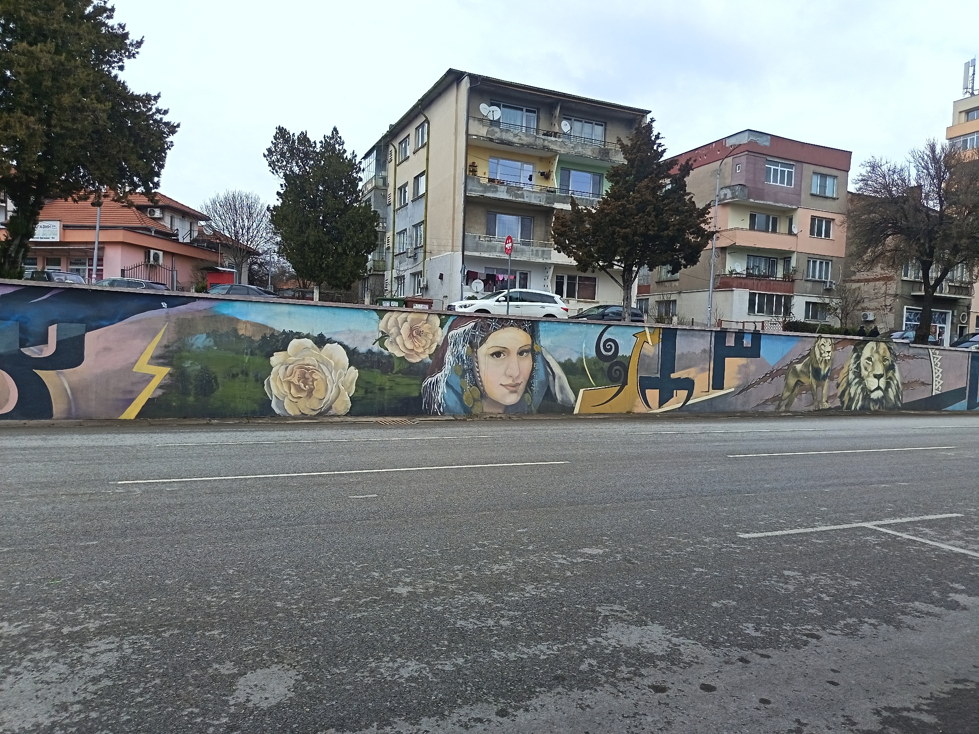 The image displays an urban street scene in Mezdra, Bulgaria, under an overcast sky. The perspective is low, looking across a two-lane asphalt road towards a long, colorful mural painted on a wall. The road surface appears damp, exhibiting scattered wet patches and a single solid white line marking a lane boundary. The mural, stretching across the midground, features a diverse array of subjects. From left to right, it includes abstract yellow lightning bolt shapes, two large, pale yellow roses, a central portrait of a woman with dark eyes, light skin, and an elaborate blue and silver patterned head covering, followed by abstract geometric forms, a stylized "L" or similar character, and a depiction of a mountainous landscape. The right portion of the mural showcases two lions: one standing in profile and another facing forward in a close-up, both rendered naturalistically. Behind the mural, a row of urban buildings and trees are visible. To the left, a multi-story building with a terracotta roof, painted in peach tones, shows partial signage indicating "МАГАЗИН" (SHOP). Two dark evergreen trees stand prominently in this section. In the center, a five-story apartment building with varied facade colors (beige, yellow, green, grey) features balconies equipped with satellite dishes. A white SUV is parked in front of this building. To the right, another multi-story structure, appearing older with sections painted in brown and peach, features bare deciduous trees in front and a streetlamp. Further vehicles are parked along the street. No individuals are directly visible engaging in actions or interactions.