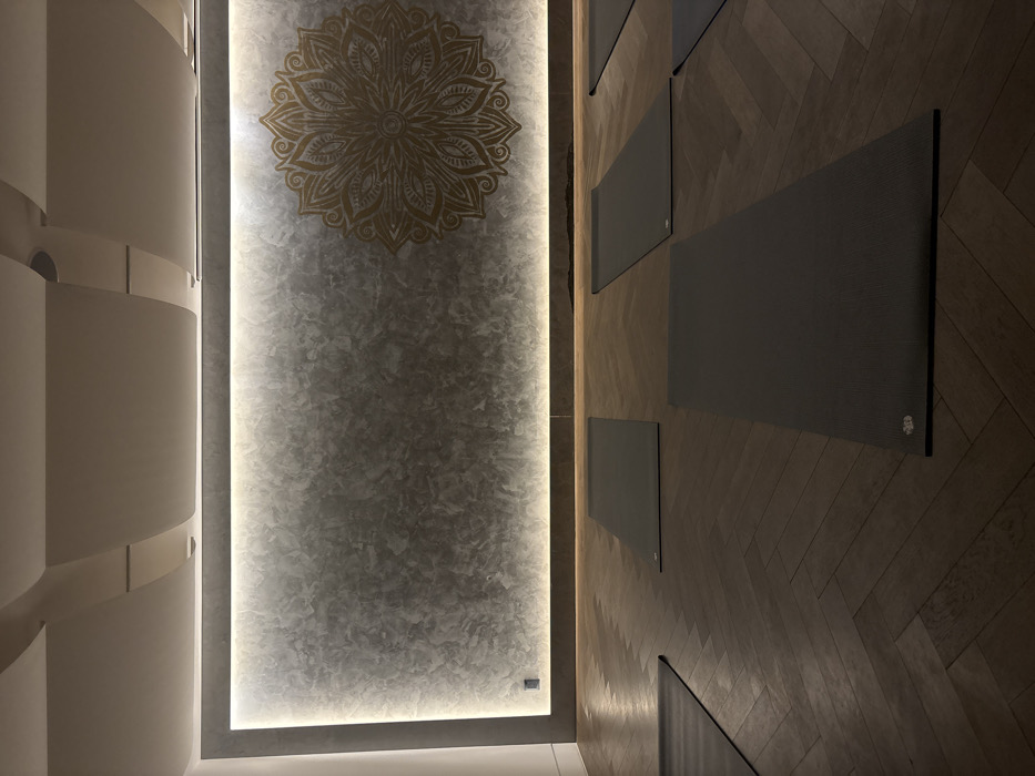 This image depicts an unoccupied, modern indoor yoga studio located in Mexico City, Mexico. The room features a dark brown herringbone-patterned wooden floor. The prominent back wall is a textured, light grey surface, illuminated by horizontal strips of warm LED lighting embedded along its top and bottom edges. A large, intricate gold mandala design is centered on the right side of this wall. Overhead, the ceiling displays light-colored, curved panels that contribute to the ambient lighting. Five dark grey yoga mats are visible, laid out flat and spaced apart on the wooden floor, with one in the foreground featuring a small white logo. No individuals are present, and no actions or interactions are occurring within the scene.