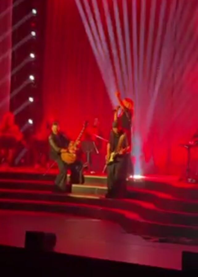 A concert stage is bathed in red light. On the stage, musicians are playing instruments. A singer, with blonde hair, is holding a microphone and raising one arm in the air. A guitarist stands next to her, while other musicians are seated behind them. A red curtain serves as a backdrop. White smoke momentarily obscures the stage. The scene is shot from the audience.