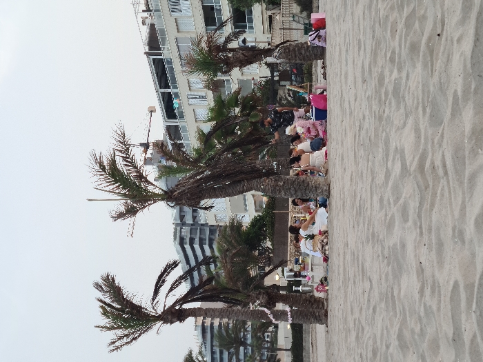 The image depicts a social gathering on a sandy beach in Alicante, Spain, under an overcast sky