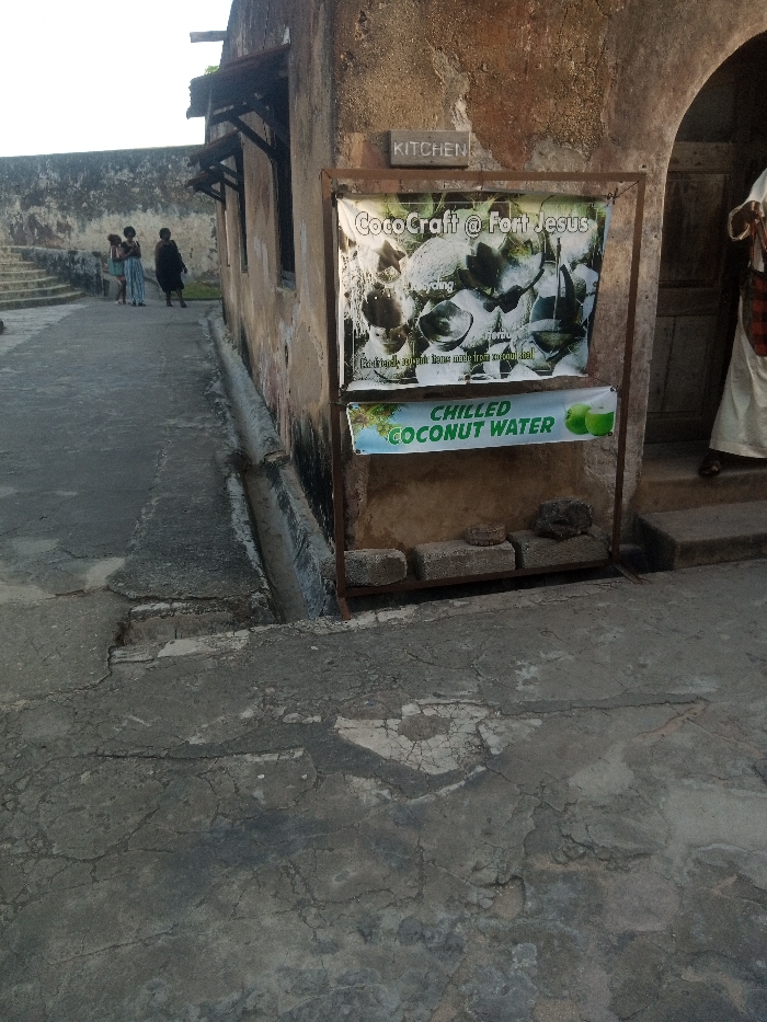 The image depicts an outdoor scene within Fort Jesus, located in the Makadara/Mji Wa Kale ward of Mombasa, Kenya. In the foreground, a cracked and uneven concrete ground surface occupies the lower half of the frame. To the right, an aged, textured stone wall runs vertically, featuring a narrow, concrete drainage channel at its base. A small, rectangular wooden sign reading "KITCHEN" is mounted on this wall. Below it, a metal stand holds two banners: the upper banner displays "CocoCraft @ Fort Jesus" with images of coconut shell crafts and text reading "Traditional artwork items made from coconut shell"; the lower banner advertises "CHILLED COCONUT WATER" with illustrations of green coconuts. Below these banners, the metal stand forms a shelf holding several rough-hewn concrete blocks and a dark, amorphous object. To the far right, partially visible at an entrance, a person stands wearing a long, light-colored garment and sandals, with a red and black plaid bag hanging over their shoulder. To the left of the wall, a concrete walkway extends into the midground. Three individuals are visible on this walkway further down: one in light-colored clothing and shorts, another in a striped garment, and a third in dark attire. Their specific actions are indeterminate. Further left, a series of stone steps ascend along another stone wall that forms the outer perimeter of the structure, visible in the background against a light sky. The overall lighting suggests ambient daylight, casting some areas into shadow.