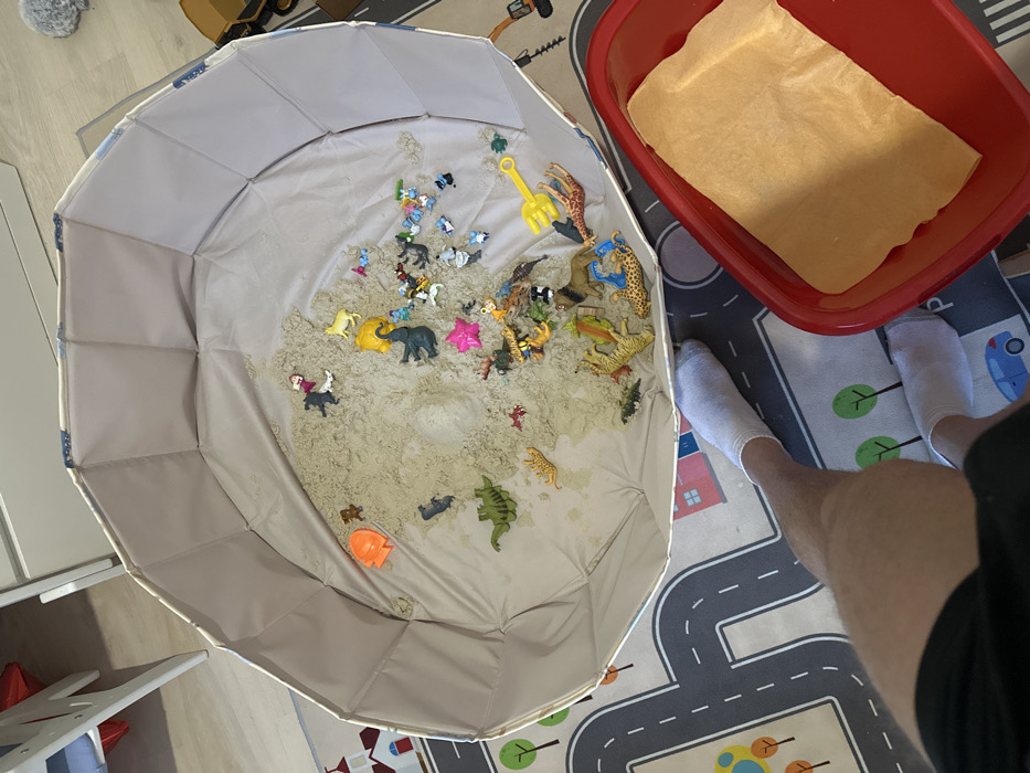 An elevated view in a room in Murino, Russia, captures a child's play area. A collapsible, hexagonal, beige-colored fabric sandpit occupies the central frame, containing a quantity of light-colored sand distributed unevenly, with a small mound centrally located. Within the sand, an assortment of plastic toy figures is present, including various animal species such as elephants, lions, tigers, giraffes, leopards, dinosaurs, and smaller generic animals, alongside numerous small human-like figures, an orange plastic shovel-like object, and a yellow plastic rake. The sandpit rests on a gray children's playmat featuring a road, building, and tree pattern. In the lower right corner, a red rectangular plastic tub holds a piece of creased light brown paper or fabric. The lower legs and feet of an individual, clad in white socks and dark shorts, are visible in the foreground, positioned above the playmat. In the background, to the left, a portion of light-colored furniture and a white chair are visible. To the far right, a yellow toy truck is partially visible on the playmat.