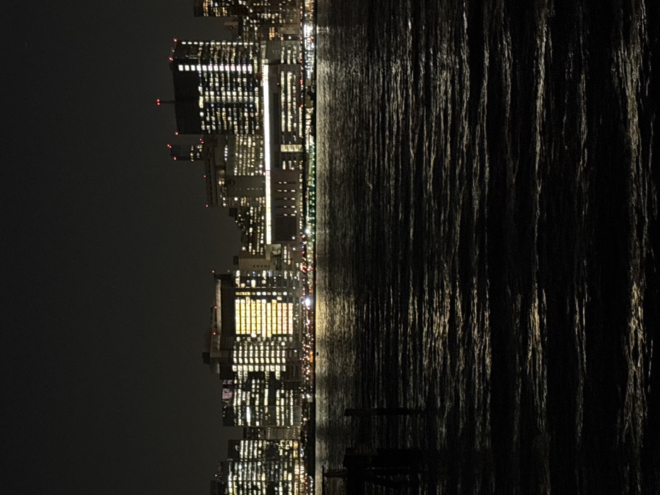 A nighttime cityscape is illuminated with countless lights, showcasing a dense urban environment. The lights are reflected in the dark water, creating a shimmering effect. The buildings, varying in height, form a strong contrast against the dark sky and water. The image is vertically oriented, enhancing the perspective of the towering buildings and the vast expanse of water.