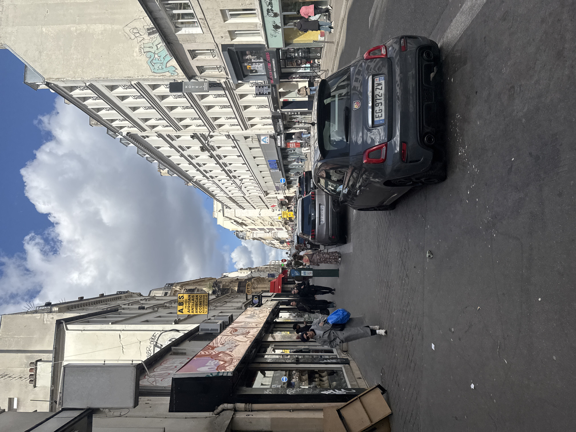 The image depicts a bustling street scene in a commercial district of Paris, France, observed from a pedestrian's perspective. The street runs straight into the distance, flanked by multi-story, light-colored Parisian buildings typical of Haussmannian architecture, featuring numerous windows and some wrought-iron balconies. The sky above is partly cloudy with significant patches of blue. In the immediate foreground on the right, a dark grey Abarth 595 compact car (French license plate EG-972-ZW) is parked or slowly moving on the asphalt road, angled slightly towards the viewer. The car has black rims and twin exhaust pipes. Directly behind it, a silver Peugeot SUV with a partially visible French license plate (FY-371-...) is also on the road. On the left-hand sidewalk in the foreground, a person wearing a grey coat, black pants, white sneakers, and sunglasses walks towards the camera, carrying a bright blue reusable bag. To their left, two flat, brown cardboard boxes lean against a building facade. The sidewalk itself is paved with grey interlocking pavers. Further down the left sidewalk, several pedestrians are visible walking away from the camera. Shopfronts line this side of the street, including one with a prominent yellow and black sign displaying "A.B.S. FRANCE AFRICAN ANTILLAIS AMERICAN COSMETIC." Large display windows beneath this sign showcase various items, possibly footwear or other merchandise. Graffiti is present on the upper levels of some buildings on both sides. On the right-hand side of the street, the sidewalk also features pedestrians and various shopfronts. A vertical black sign with white text, partially reading "HOTEL" and "Plein Cœur de Paris," is visible. Other businesses include "ALDI" and "AMERICAN COSMETIQUES." A green street pole with a red circular sign is present on this sidewalk. The road surface is dark asphalt, showing some minor debris and tire marks. The sidewalks appear generally clean with some scattered small pieces of litter. Sunlight illuminates the scene from the right, creating shadows on the left side of the street and buildings.