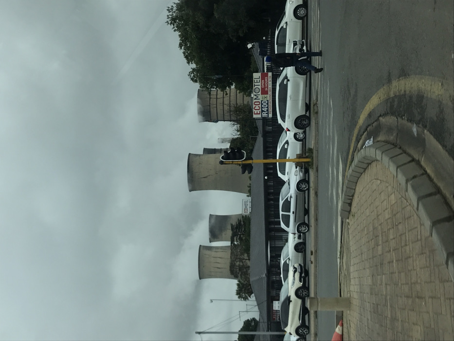 Four large, gray, industrial cooling towers are visible under a cloudy sky. A row of white cars is parked alongside a street with a sidewalk. A pedestrian crosses the street at a crosswalk controlled by a traffic light. A sign for "ECO MOTEL" is visible near the cars. The overall scene suggests a juxtaposition of industrial infrastructure with commercial and residential elements.