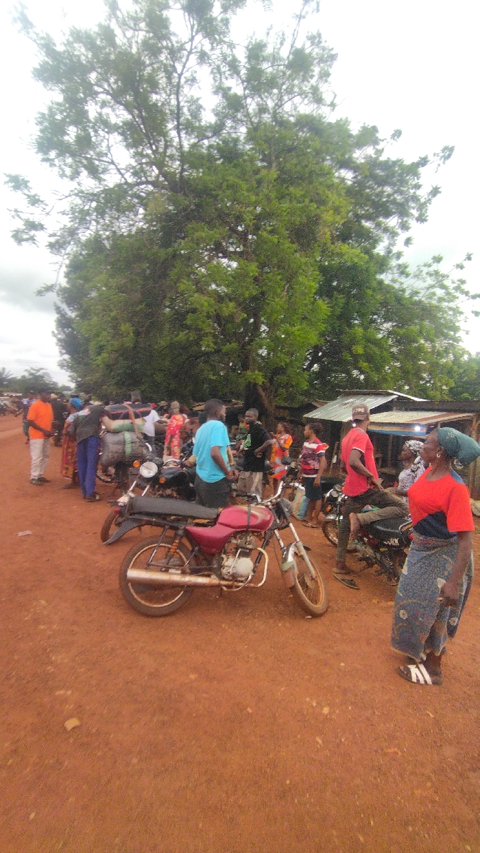 The image depicts an outdoor gathering in the city of Ito, Nigeria, under an overcast sky