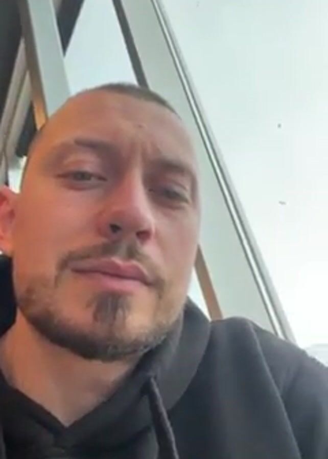 man in a black hoodie looking at the camera. He has short, shaved hair, a goatee, and a scar above his left eyebrow. He looks out the window. The camera then shows a view of a harbor from the window. There are mountains covered in snow in the background. A few birds fly above the water. The sky is gray and overcast. The video ends with a view of the water and snow-covered mountains.