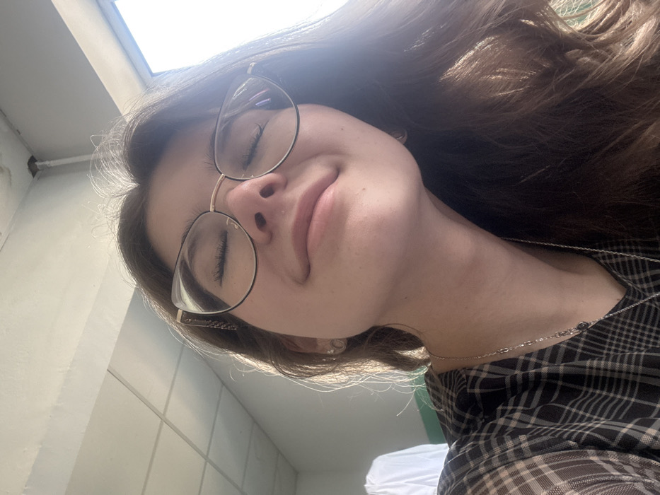 A close-up, low-angle portrait depicts a young female subject indoors. Her eyes are closed, and her lips form a subtle smile. She wears gold-framed, cat-eye style eyeglasses with dark, patterned temples. A thin silver-colored chain necklace with small circular elements is visible around her neck, and a small, silver-colored stud or hoop earring is present in her left ear. Her long, dark brown hair frames her face, displaying bright highlights from a light source on the right. She is wearing a dark, possibly plaid or checkered, long-sleeved top. The background consists of a white ceiling with visible panel lines and a bright window on the right side of the frame, emitting strong light. A segment of a dark green or teal wall and a white, possibly folded, garment or fabric are partially visible on the left. No specific identifying features are present to pinpoint a precise location within the city of Pernik, Bulgaria, beyond an indoor room setting.