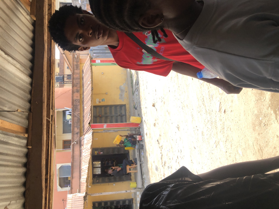 The image portrays an outdoor scene in Satellite Town, Nigeria, observed from under a corrugated metal roof supported by wooden beams