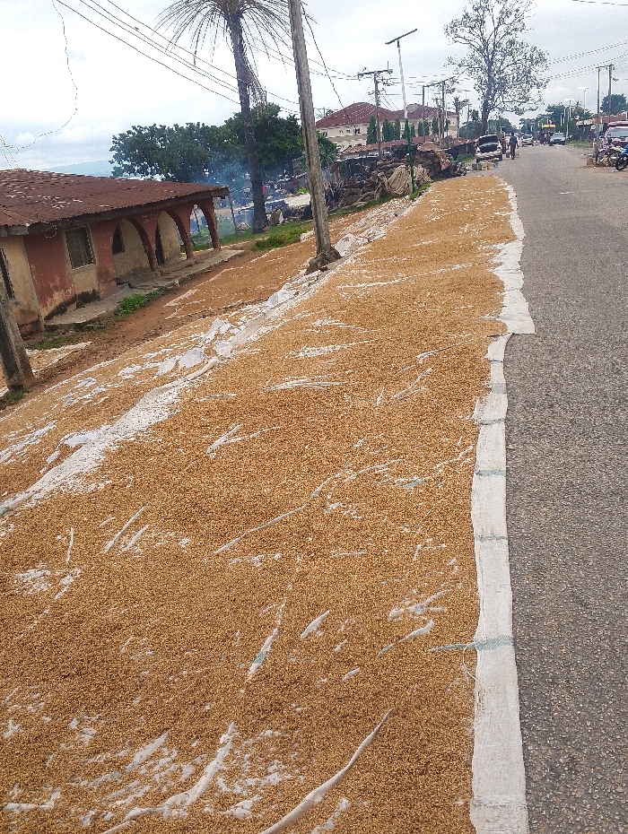 This image depicts a roadside scene in Lokoja, Nigeria. The foreground is dominated by a large quantity of light brown, unhulled grain (likely rice or millet) spread thinly on white tarpaulins over an unpaved, sloped embankment adjacent to a paved road. The grain extends along the roadside, indicating a drying process. To the left, a single-story building with a faded red exterior and a reddish-brown corrugated metal roof features multiple arched openings. A tall palm tree stands behind this structure, and smoke is visible rising from the area, suggesting an active fire or burning activity. Parallel to the grain-covered embankment runs a gray asphalt road. On the far side of the road, various vehicles, including cars and motorcycles, are visible in the distance, indicating traffic. Several utility poles with electrical wires and one with a street light fixture line the road. Further down the road, piles of sacks or bundled materials are stacked on the unpaved shoulder. In the background, residential buildings with red roofs are visible, interspersed with green trees. The sky is overcast. Sparse human figures are discernible in the distance along the road.