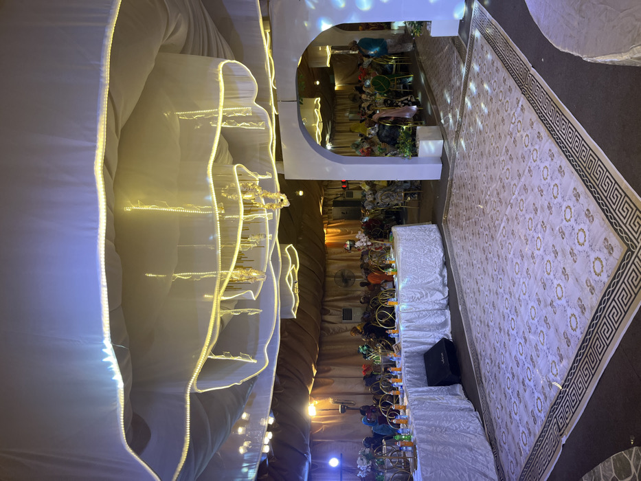 An interior shot of a wedding reception area. The room features a large, patterned rug and white, draped decorations with decorative lighting. People sit at tables with gold-colored chairs. A raised, white-walled area is visible at the top of the image. Overall, the space is well-lit with both overhead and decorative lights, lending a celebratory atmosphere.