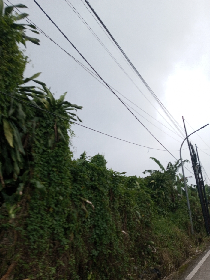 An outdoor scene in Sandamal Eliya, Sri Lanka, depicts a dense natural environment adjacent to a paved surface under an overcast sky. The upper third of the frame is occupied by a light grey, uniformly overcast sky. Multiple dark overhead utility lines traverse horizontally and diagonally across the upper and mid-sections of the image, converging towards the right. On the left and extending across the center, a dense wall of green vegetation is visible. This includes a thick layer of vine-like plants with small, roundish leaves covering what appears to be a vertical embankment or structure. Interspersed within this foliage, particularly in the upper-left to mid-left, are larger, pointed, dark green leaves resembling a succulent or agave. Further to the right, amidst the dense greenery, several broad-leafed plants, consistent with banana trees, are observable. The ground level along the right edge of the vegetation shows overgrown grass and minor debris. In the mid-right, a dark utility pole stands vertically, fitted with an outward-curving street light fixture. Additional electrical components are attached to the pole below the light. A segment of dark grey paved road or shoulder is visible in the bottom-right corner, indicating the perspective is from or alongside a thoroughfare. No individuals or animals are present, and no discernible actions or interactions are depicted.