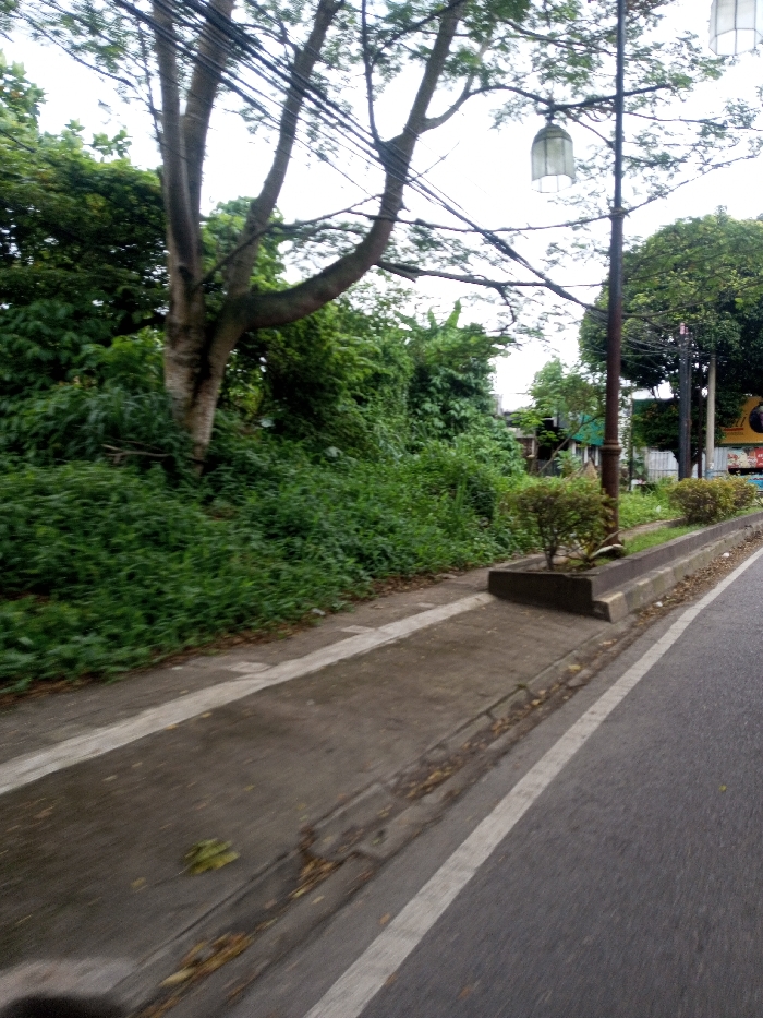 This image depicts a roadside scene in Khajuripada, India. The foreground shows an asphalt road with a solid white line marking the right edge of a travel lane. Adjacent to the road is a concrete sidewalk, also featuring a parallel white line, which leads to a raised curb separating it from a strip of cultivated land. Scattered dry leaves are visible on the road and sidewalk. In the midground, a dark brown metal lamppost stands upright, fitted with two ornate, bell-shaped streetlights equipped with translucent white covers. To the left of the lamppost, a row of small, trimmed bushes grows within low concrete planters. Behind these bushes, and extending across the left side of the frame, is a dense area of overgrown green foliage, bordering a substantial tree with multiple visible trunks and branches extending upwards and right. Numerous black power lines are strung horizontally across the upper midground, partially obscuring the tree canopy. The background reveals more dense green trees and foliage, with glimpses of what appear to be low-rise structures or buildings partially visible through the vegetation on the right. The sky overhead is overcast and bright, suggesting daytime conditions. No individuals, animals, or active interactions are visible.