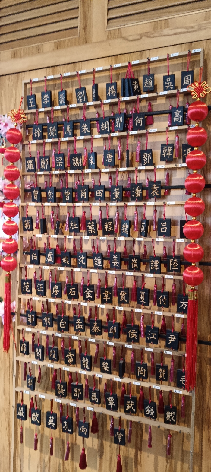A wooden display holds rows of dark tags with gold-colored Chinese characters, suspended by red strings