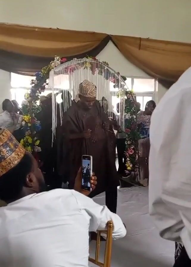 man in a brown outfit and traditional hat dancing in front of a decorated archway at what appears to be a wedding. Another man is seated, facing the dancer, recording the performance on his phone. Other attendees can be seen in the background. The room is decorated with white fabric and floral arrangements, and there are chairs set up for guests.
