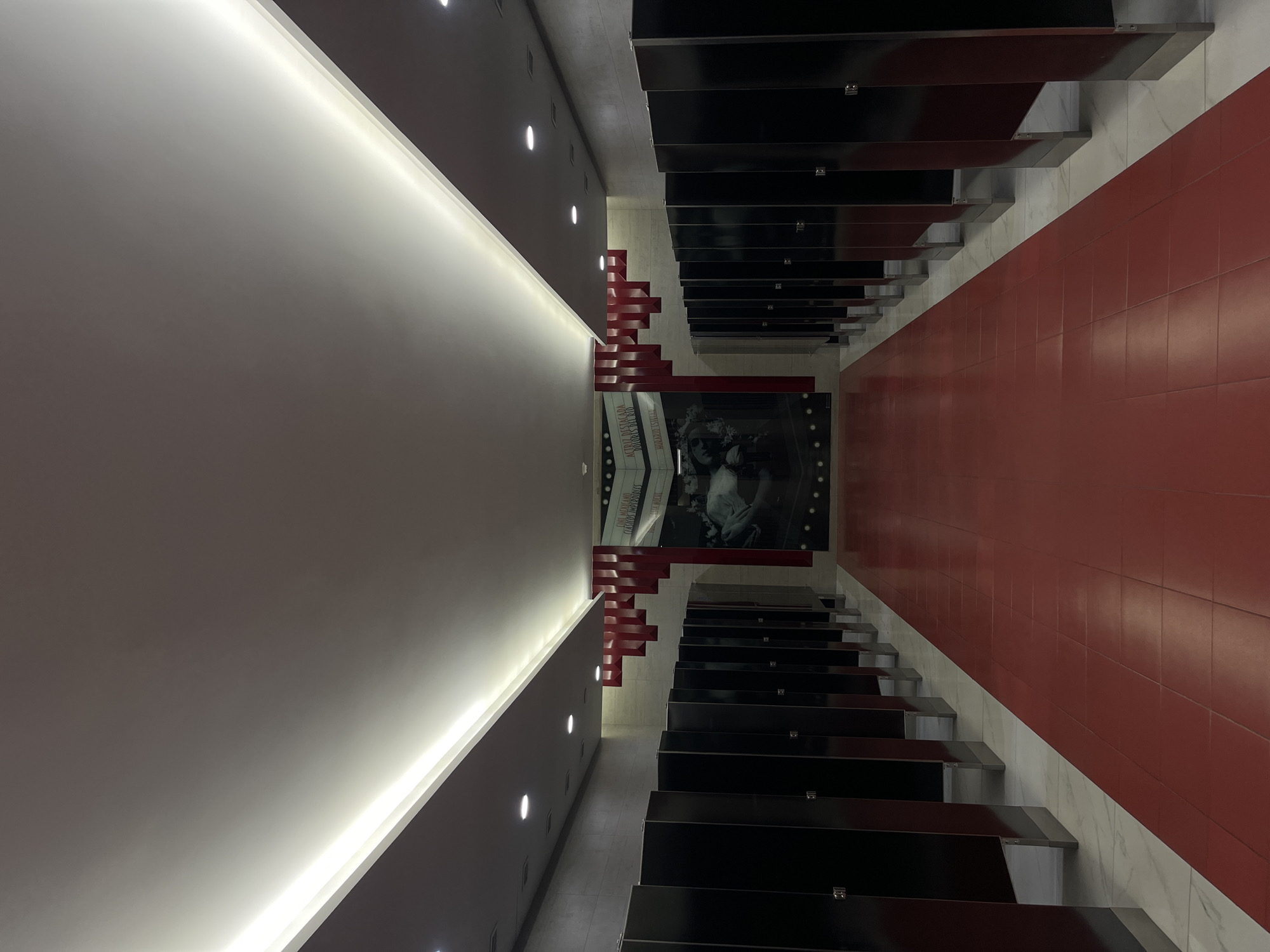 The image depicts the interior of a brightly lit public restroom corridor in Santa Lucía, Mexico. The perspective is centered, looking down a long, symmetrical hallway lined with numerous dark-colored restroom stalls on both the left and right sides. The floor features a central pathway of reddish-brown square tiles, flanked by lighter, possibly white or light grey, marble-patterned tiles beneath the stalls. The walls are clad in horizontal, light grey rectangular tiles. The white ceiling incorporates linear cove lighting along its edges and multiple recessed circular lights, providing uniform illumination. At the far end of the corridor, a prominent red geometric structure, composed of stacked rectangular elements, forms a decorative arch-like feature. Below this structure, a large, backlit display or mural is visible. Text on the display reads "CINE MEXICANO CLASICOS IMPERECEDEROS" (Mexican Cinema Imperishable Classics), and further details identify "ACTRIZ DESTACADA DOLORES DEL RIO" (Featured Actress Dolores del Rio) and "HORACIO ESTEBAN." The mural contains classic film imagery, predominantly in black and white, featuring human figures. A horizontal line of small, circular, light-colored decorative elements is positioned along the bottom of this display. No individuals or active events are present within the scene.