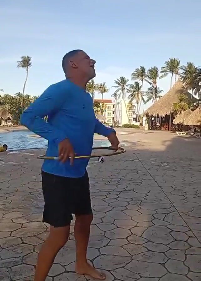 A man is standing outdoors in a resort area. He is barefoot, wearing a long-sleeved blue shirt and black shorts. He is holding a gold hoop in both hands, attempting to spin it around his waist. Behind him is a pool, palm trees, and thatched-roof buildings. The ground is paved with patterned stones. He appears to be enjoying himself.