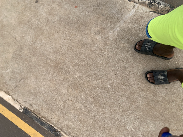 The image displays a ground-level perspective in Zango-ndaji, Nigeria. Two human feet, wearing black slides with a light-colored pattern on the upper strap, are positioned on a light brown, textured concrete surface. A section of a neon green pant leg is visible around the lower left foot. A small blue object is partially visible at the top left corner, held by a hand. The upper right portion of the frame shows a dark asphalt road surface with two parallel yellow traffic lines, separated from the concrete by a dark, worn curb line.
