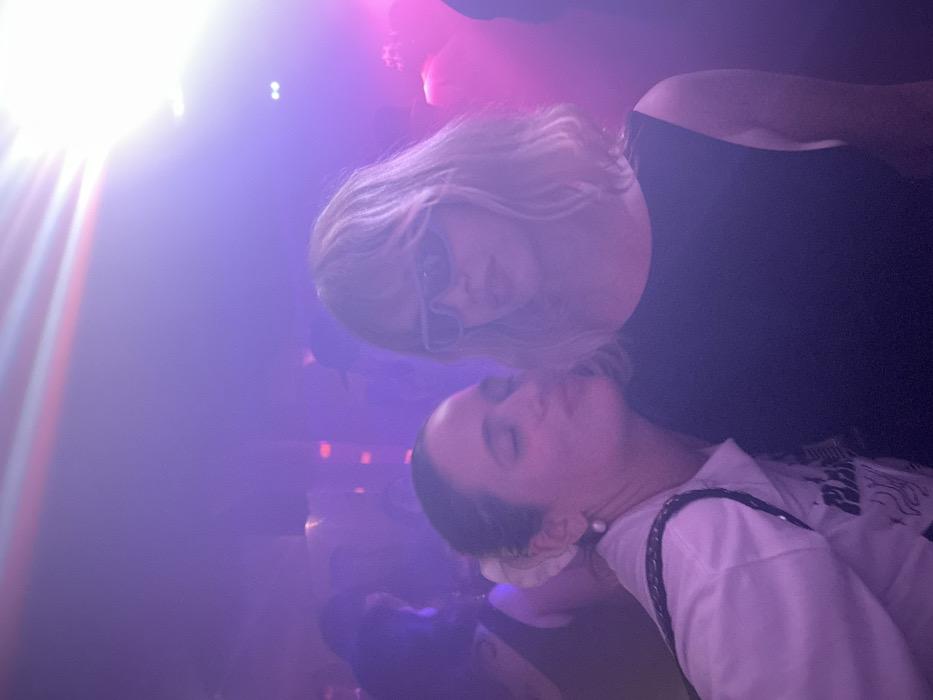 This image captures two adult females in a dimly lit indoor environment, identified as a nightclub or similar social venue in Paris, France