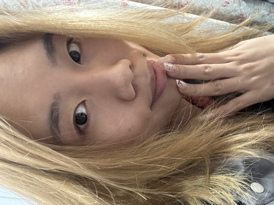 A young adult female of East Asian descent is depicted in a close-up portrait, looking directly at the camera. She has long, blonde hair and dark, notably large irises. A subtle smile is present. Her right hand is positioned with fingers resting against her chin and lower lip. Her manicured fingernails display clear polish adorned with small red polka dots and a red bow design on the right pinky finger. She wears a dark-colored jacket, indicated by a visible silver snap button on the left side of the frame, over a rust-colored or red-orange undergarment. The background is blurred, showing a light-toned fabric with a floral pattern, consistent with an indoor setting. The scene is identified as being in Shapingba District, China.