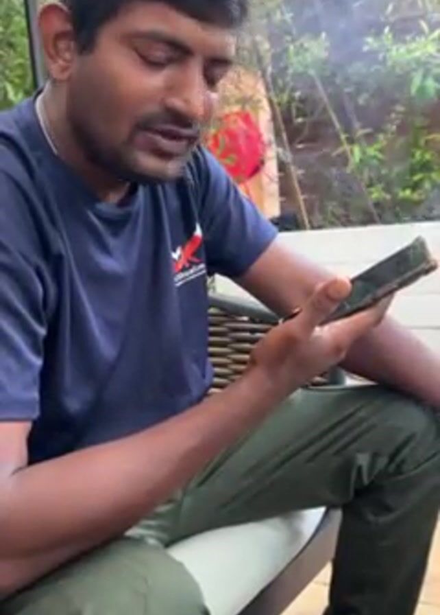 A man is sitting on a patio chair holding a phone. He has dark hair and a mustache. He is wearing a dark blue t-shirt with a red and white logo on it and green pants. He is looking at the phone and appears to be reading from it. He then looks up and smiles. The background shows greenery and a hint of smoke in the air. The patio is paved with light-colored stones.