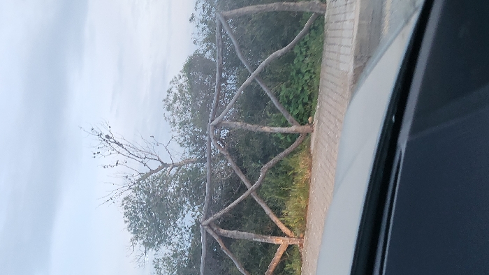 The scene is an exterior view in Santa Ponça, Spain, captured from the interior of a vehicle. The lower portion of the frame displays the dark grey dashboard and the base of the windshield of the vehicle. Immediately beyond this, a light grey paved area, likely a sidewalk or curb, is visible. A rustic fence, constructed from irregular, natural tree branches forming X-shaped cross-members between vertical posts, extends horizontally across the midground. Behind this fence, dense green vegetation, including various shrubs and tall grasses, is present. Further in the background, larger trees with both full green foliage and some sparse or bare branches are visible against an overcast sky filled with light grey clouds. No individuals, animals, or active interactions are discernible within the frame.