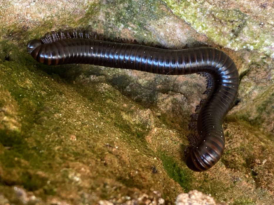 - "A dark brown to black millipede, approximately 10-15 cm in length, is observed on a moss-covered rock surface in Nguzu Edda, Nigeria" by FM-6XMFv1, licensed under CC BY 4.0