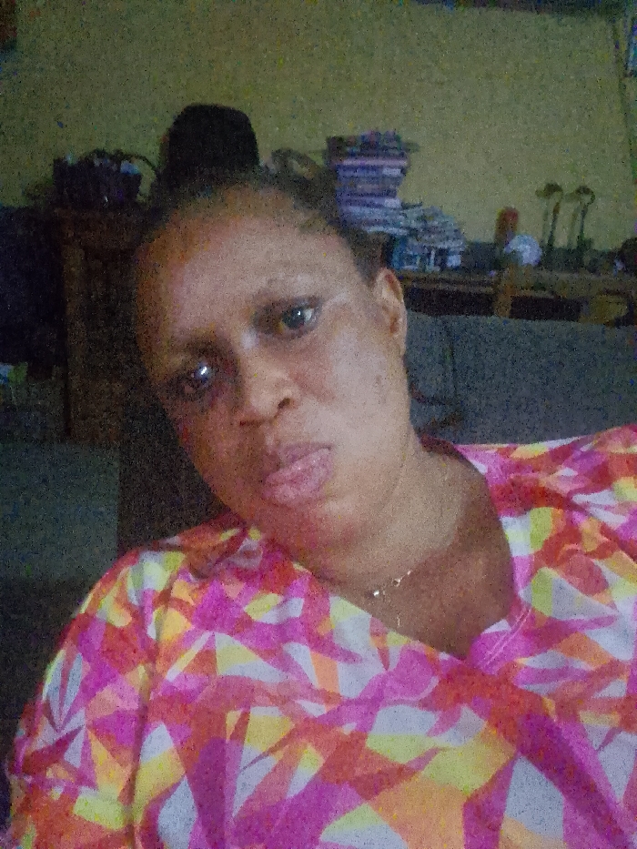 An adult female subject is depicted in a grainy, chest-up indoor portrait, captured in Lagos, Nigeria