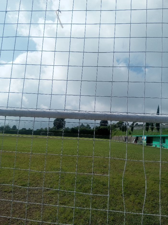 The image displays an outdoor sports field, likely a football pitch, viewed through a wire mesh net
