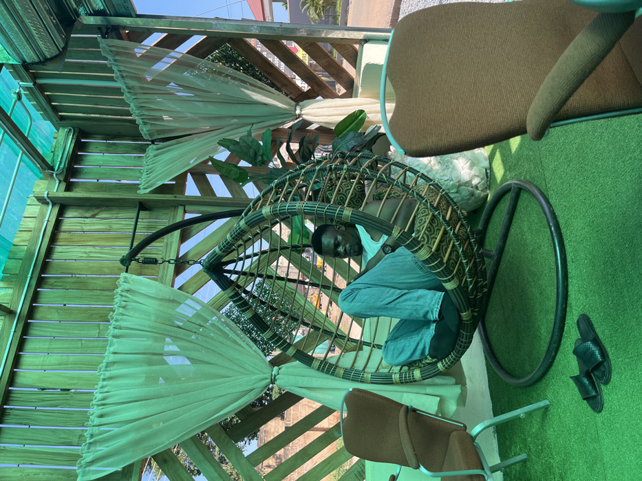 - "This image, captured in Dome, Ghana, depicts an adult male seated in a dark brown wicker hanging egg chair within a semi-outdoor enclosure" by FM-Nlg7v2, licensed under CC BY 4.0