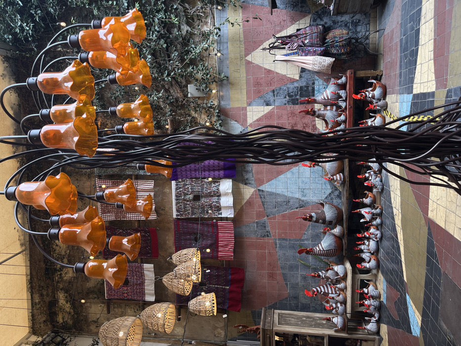 The image showcases an eclectic indoor market or courtyard. Woven textiles hang vertically, interspersed with decorative lamps. On the right, shelves display whimsical ceramic bird figurines in orderly rows. Above, a striking chandelier with orange, flower-like shades contrasts with strands of industrial cables. The floor exhibits a geometric tile pattern with triangles of varying colors, adding to the space's unique aesthetic. Vegetation climbs up a wall on the left.