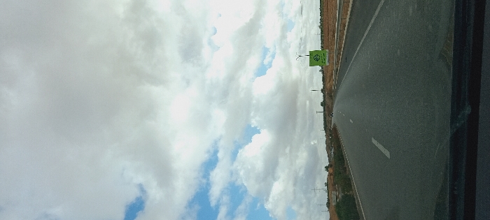 The image displays an asphalt road extending into the distance with a slight left curve, viewed from a vehicle's interior as indicated by the lower windshield frame. A single white dashed line marks the center of the visible lane. The sky overhead is partially cloudy, featuring a mix of white and grey cumulus clouds with interspersed patches of blue. To the left of the road, sparse green foliage lines the shoulder, and utility poles are visible in the background. To the right, a wide, dry, earthen shoulder is present, hosting a green billboard with white text and a circular green logo, alongside a black, street lamp-like structure. Multiple vehicles are discernible in the far distance on the road. This scene is located in an outdoor environment in Majjate, Morocco.