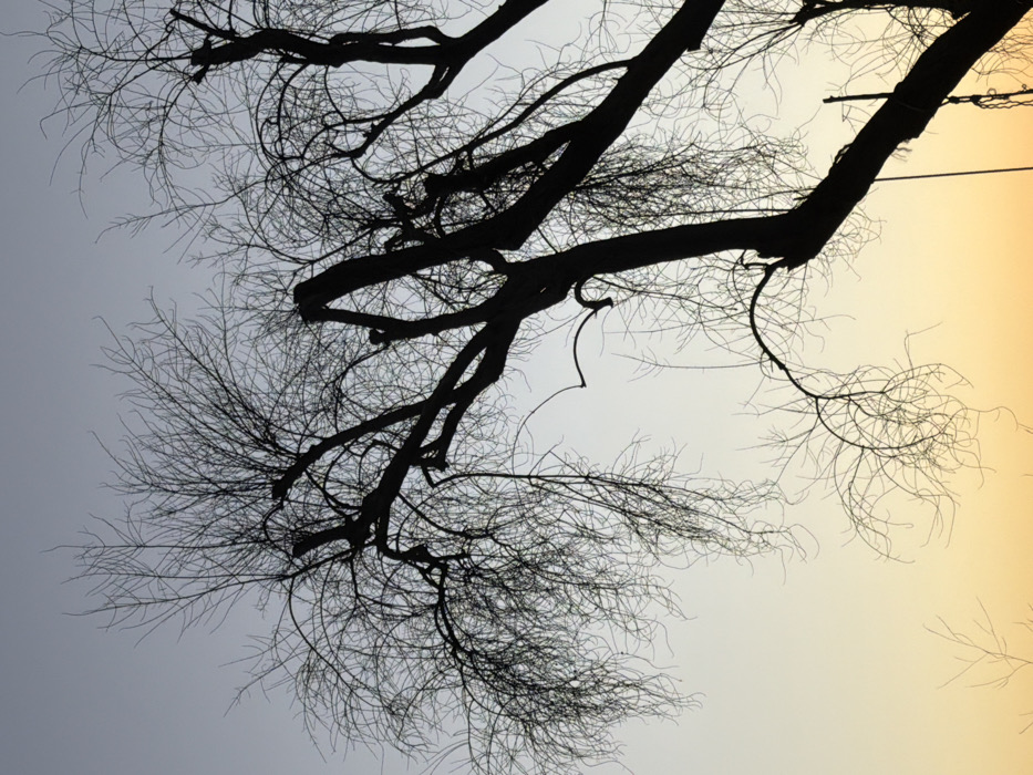 A stark silhouette of bare tree branches against a gradient sky. The branches, devoid of leaves, are intricate and dense. The sky transitions from a soft gray to a warm yellow, suggesting either dawn or dusk. The composition emphasizes the patterns and textures created by the stark contrast between the dark branches and the light sky.
