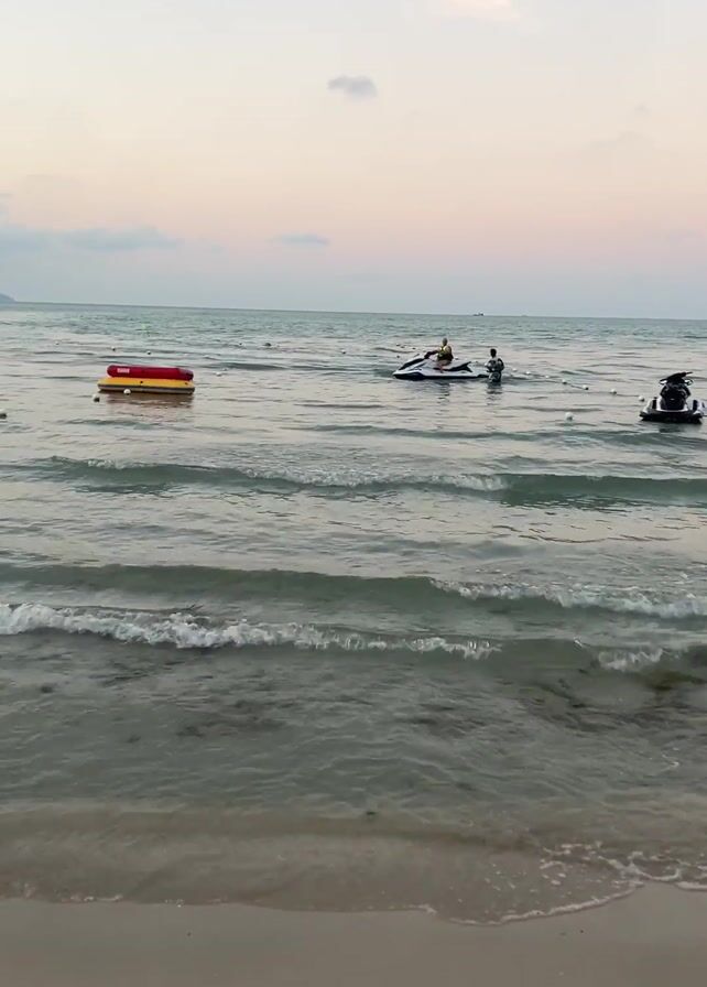 beach scene at dusk. Two jet skis are in the water along with an inflatable raft. Two people can be seen interacting with one of the jet skis. There are dark colored buoys floating in the water. Waves are gently rolling onto the sand. A mountainous landscape is visible in the distance. The sky is a mix of light blue, grey, and pink.