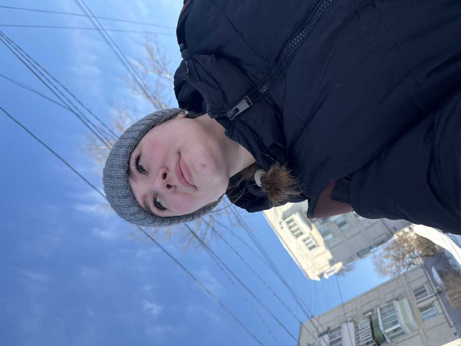 An outdoor, low-angle photograph captured in the city of Chaikovsky, Russia, depicts a young female looking upwards on a clear, sunny winter day