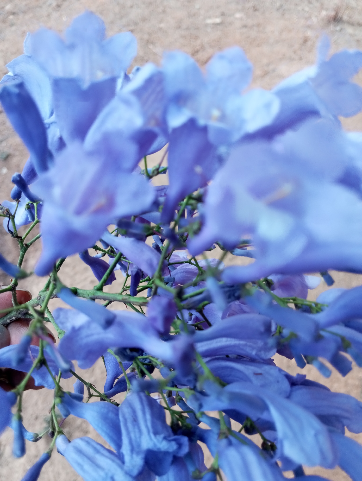 A close-up photograph displays a cluster of vibrant periwinkle-blue to purple bell-shaped flowers with green stems. A human hand, with a visible thumb and index finger, is partially visible on the lower-left side, gripping the main stem of the flowers. The flowers are generally in soft focus, with some sharper details on individual blossoms and stems, while others are intentionally blurred to create depth. The background is uniformly out of focus, depicting a light brown, earthy, or sandy surface. The image does not contain sufficient visual information to determine a specific location within the city of Jos, Nigeria, or any other geographic area.
