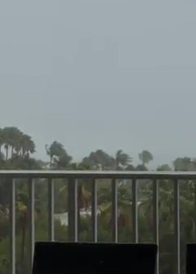From the viewpoint of a balcony, a high wind is blowing palm trees against a gray sky