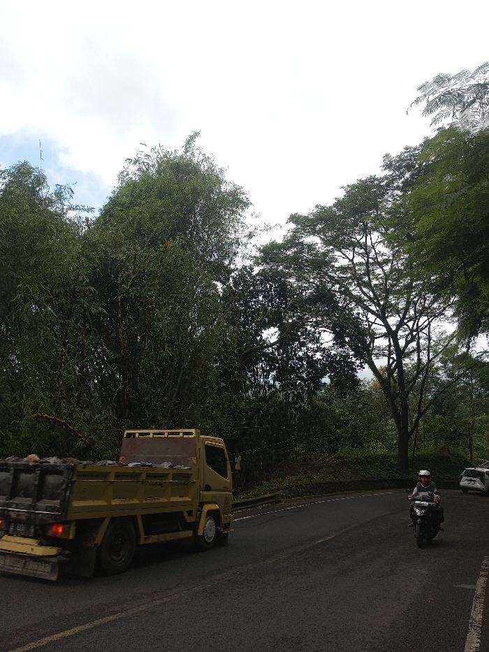 A tan truck loaded with rocks travels along a winding asphalt road. A motorcyclist approaches on the opposite side, while a white car is parked further ahead. The road is surrounded by lush green vegetation, including tall trees and dense bamboo. The sky is overcast and gray.