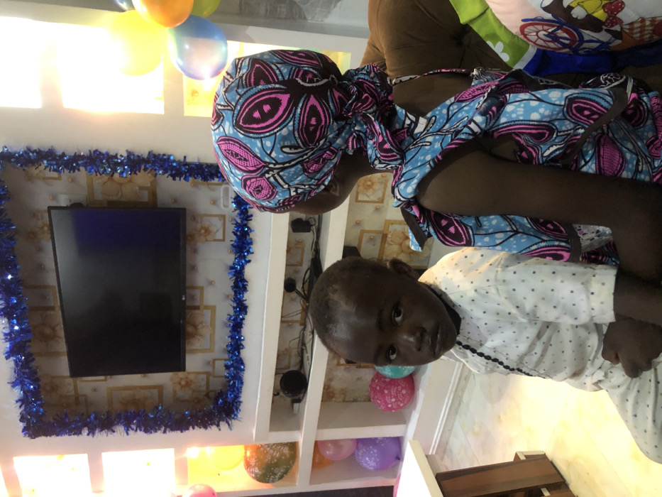 The scene depicts an interior room, located in Barakin Acha, Nigeria, decorated with festive elements. A young, dark-skinned child, identified as male, is positioned in the left foreground, wearing a white long-sleeved shirt with a subtle dot pattern and black beaded ornamentation on the front. He looks directly towards the camera. To his right, with her back to the camera, is a second individual, wearing a patterned headwrap and a sleeveless dress in blue, pink, and brown African print. This individual is seated on brown upholstered furniture. The background features a wall with a subtle patterned wallpaper. A wall-mounted flat-screen television, branded "LG," is centrally placed, framed by blue tinsel garland. Below the television, a white shelving unit contains speakers and other electronic components. Multiple inflated balloons in yellow, orange, blue, pink, and purple are visible throughout the background. A partial view of a light-colored table is present in the lower-left corner.