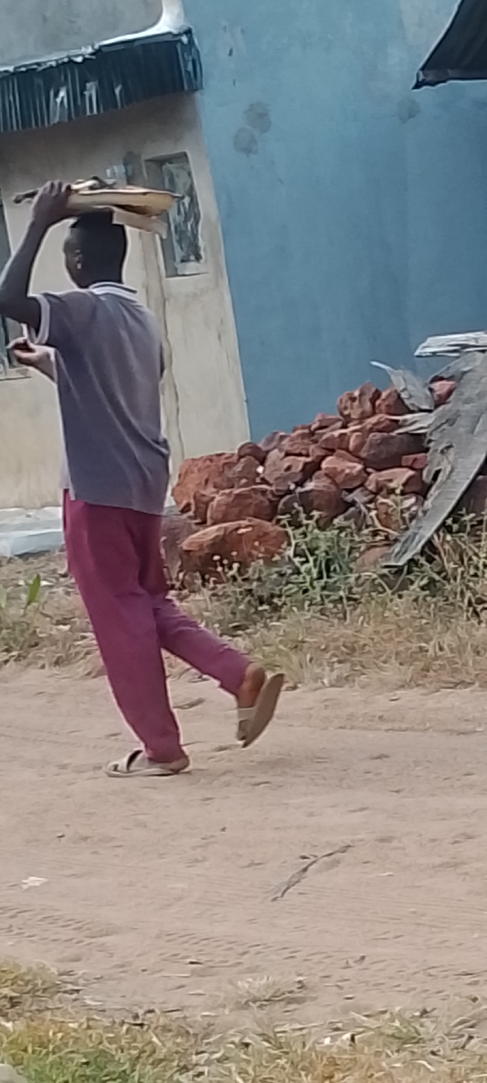 The image captures a daytime scene on an unpaved path in Adankolo, Nigeria. A dark-skinned individual is depicted from behind, walking towards the right side of the frame. The person wears a grey polo shirt with a white collar and sleeve trim, maroon pants, and light-colored flip-flops. Several pieces of wood are balanced on their head, held steady by both hands. In the background, a light-colored building with a window opening and a dark corrugated metal roof overhang is visible on the left. To the right, a pile of reddish-brown bricks or rocks is present, partially covered by a dark, possibly tarp-like material, with green vegetation growing around it. A section of a blue-painted wall is visible beyond the brick pile. The ground is composed of dirt and sparse, dry vegetation.