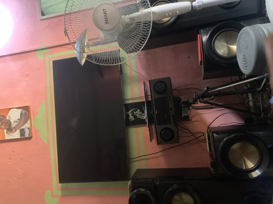 An indoor scene in a room in Gawuna, Nigeria, features a prominent entertainment system against a salmon-pink wall adorned with green horizontal and cloud-like trim. A large, black, wall-mounted flat-screen television dominates the upper-center. Above the television, a rectangular framed photograph displays a man in a white t-shirt. Below the television, an LG branded audio system, incorporating two speakers, is mounted on a stand. A smaller black framed item with a white graphic is visible on the wall behind the audio system. Numerous black electrical cables are visible connected to the equipment. To the left of the audio system, a tall, black speaker tower with a gold-colored cone is positioned. A black metal tripod stands on the floor below the audio system. To the right, a white "SMART" brand pedestal fan is visible, partially obstructing a second tall, black speaker tower. A black, cube-shaped speaker or subwoofer with a gold-colored cone is on the floor to the left of the tripod. Another similar speaker is visible to the right. A red rectangular object rests on the cube-shaped speaker on the right. In the lower right corner, a grey cylindrical object with a ridged top is present. A bright light source is visible in the upper right quadrant of the image, reflecting on the television screen.
