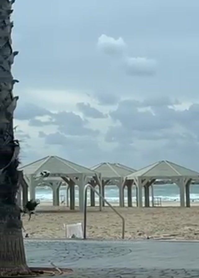 beachfront scene under a cloudy sky. In the foreground, a palm tree stands with its trunk prominently displayed, obscuring part of the view. Beyond the tree, the beach is lined with a series of identical, open-sided structures with white frames. The beach is sandy and several dark-colored birds are visible, some walking on the ground and others in flight. The ocean stretches into the distance, with gentle waves visible. The overcast sky contributes to a muted and slightly somber atmosphere. A short concrete border is seen near the bottom edge of the frame.